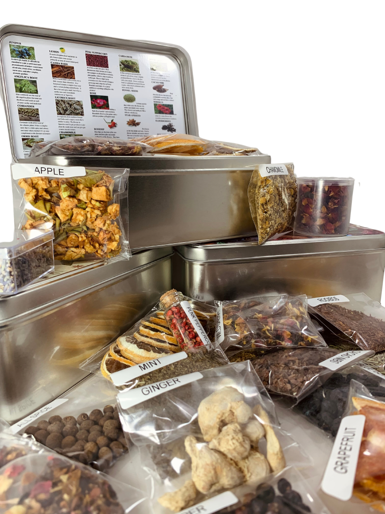 Ingredients range from juniper and angelica root to hibiscus, cacao nibs, and star anise, plus two empty infusion bags for your custom creations.